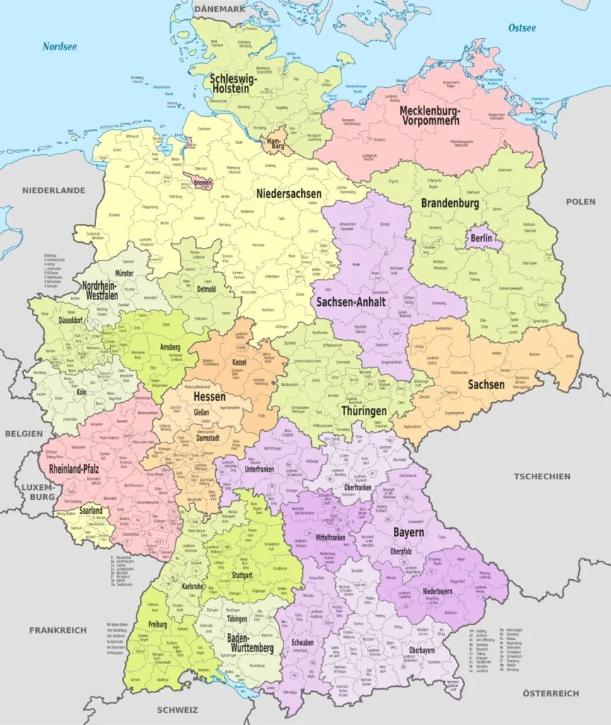 Almanya, eyaletlere bölünmüş bir ülkedir ve özellikle Türkiye gibi merkezi bir yönetim uygulayan ülkelerden Almanya’ya göç edenler için eyalet sistemi biraz karmaşık olabilir. Sizin için Almanya eyalet haritasını paylaşmak istiyoruz. Eyaletlere göre bakıldığında işte Almanya eyalet haritası şu şekilde görünüyor: