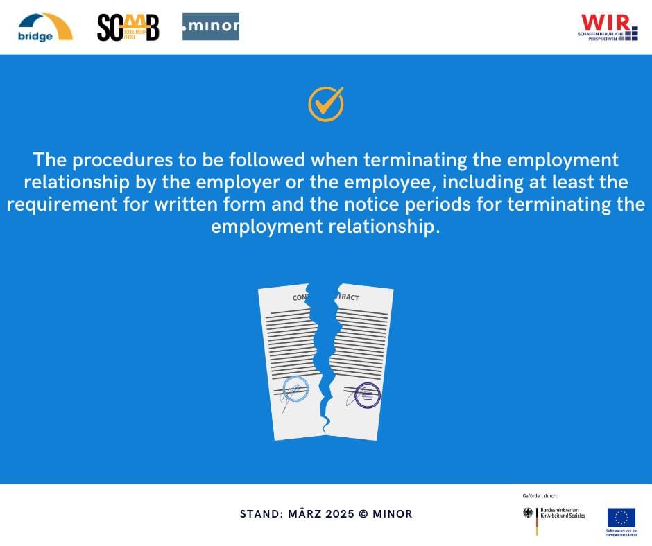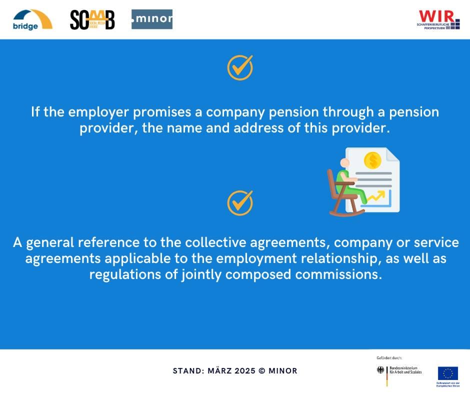 İşveren, eğer işe alacağı çalışan adayına emeklilik planı vaat ediyorsa; bu sağlayıcının adı ve adresi mutlaka sözleşmede bulunmalıdır. Toplu iş sözleşmelerine, şirket ya da hizmet sözleşmelerine ve ortak oluşturulan komisyonların düzenlemelerine de genel bir atıf yapılması, iş ilişkisinin işveren ya da çalışan tarafından sonlandırılması halinde izlenmesi gereken prosedür, yazılı olarak iş ilişkisinin sona erdirilmesine ilişkin bildirim süreleri de sözleşmenizde bulunmalıdır.