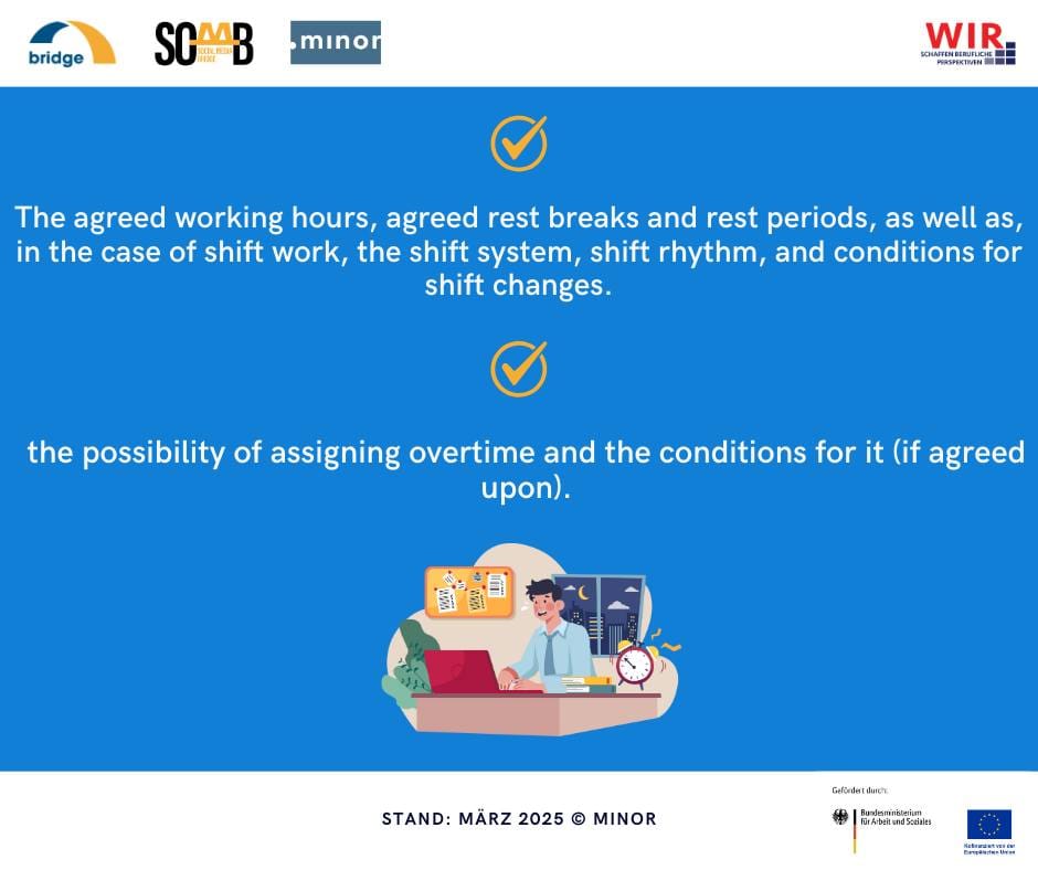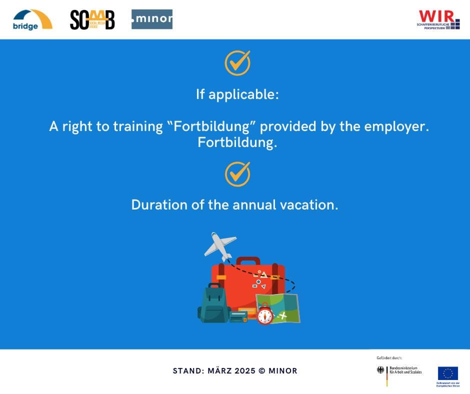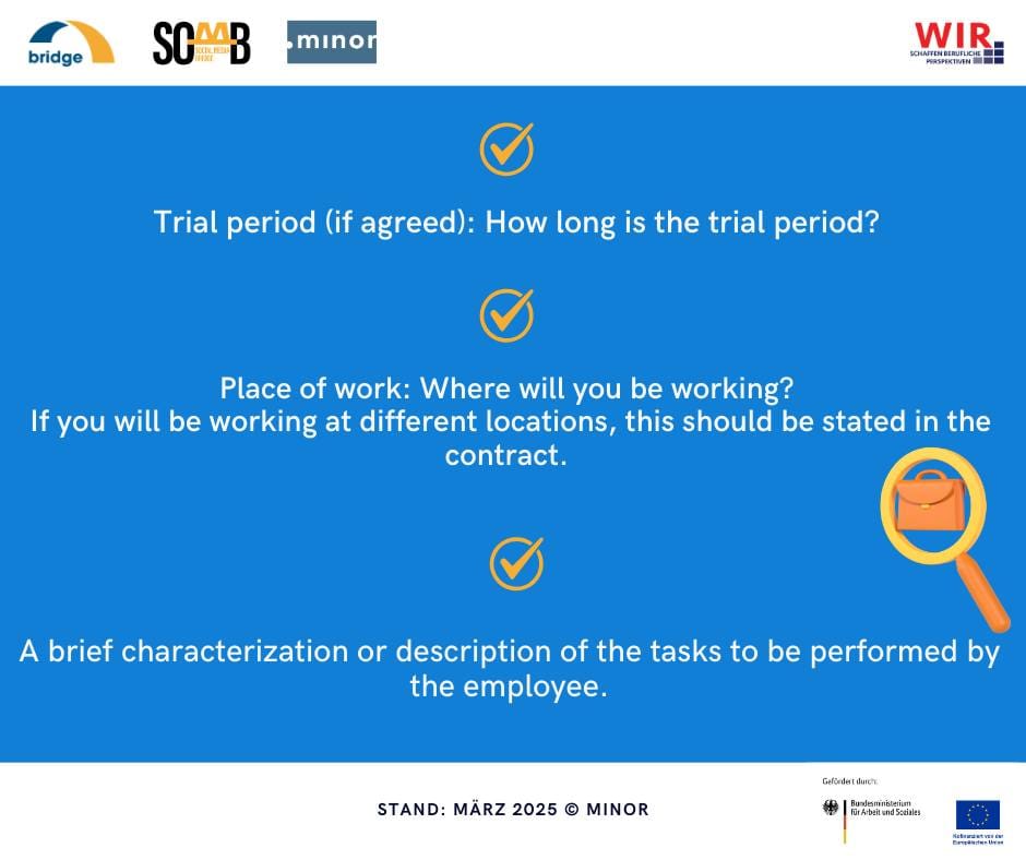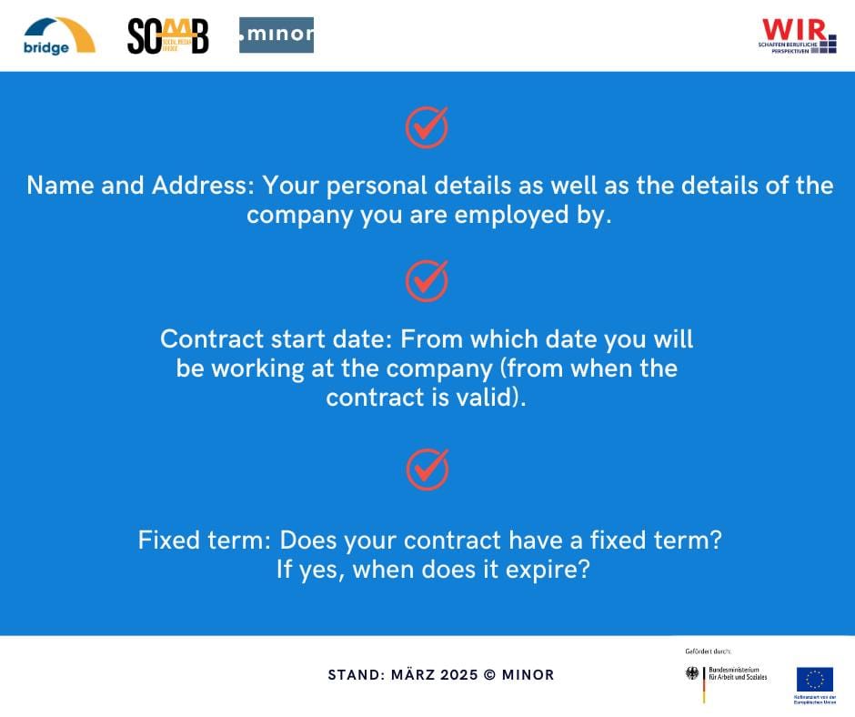 Almanya’da bir iş sözleşmesi imzalayacaksanız; sözleşmede kişisel bilgileriniz ve çalıştığınız şirketin bilgileri yer almalıdır. Şirkette hangi tarihten itibaren çalışacağınız mutlaka yazmalıdır. Sözleşmenizin geçerlilik tarihi, süreli mi yoksa süresiz mi olduğuna yer verilmelidir. Eğer süreli ise hangi tarihte sona ereceği net şekilde belirtilmiş olmalıdır.