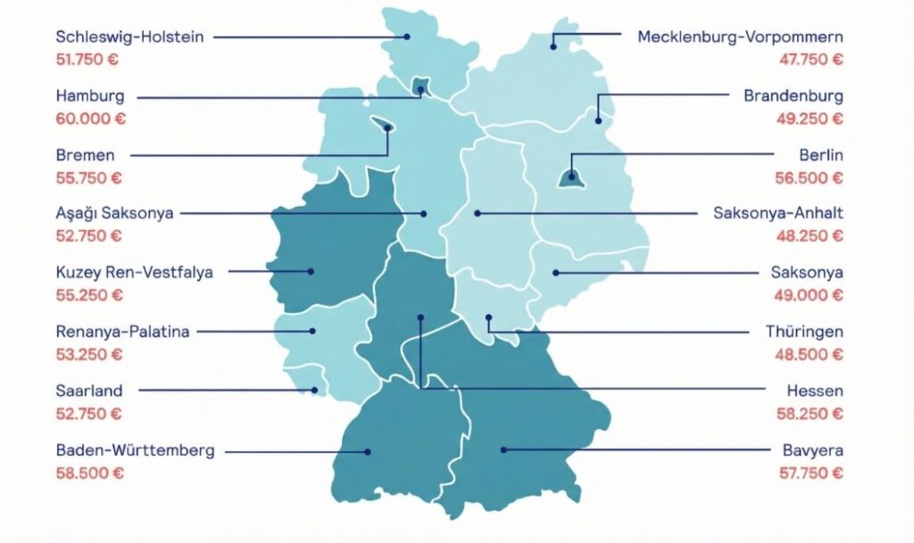 Eyaletlere göre de maaş farkları bulunuyor. Stepstone’un eyaletlere göre hazırladığı grafiğin Türkçeleştirilmiş versiyonunu aşağıda bulabilirsiniz. Bu listeye göre en yüksek gelir 60.000 € ile Hamburg’a ait, en düşük gelire bakarsak 47.750 ile Mecklenburg-Vorpommern’a ait. Doğu Almanya’da ortalama olarak maaşlar 48.750 euro olurken, Batı Almanya’da ise 56.250 euro olarak hesaplandı. Doğu ile Batı arasındaki fark ise yüzde 13 seviyesinde.